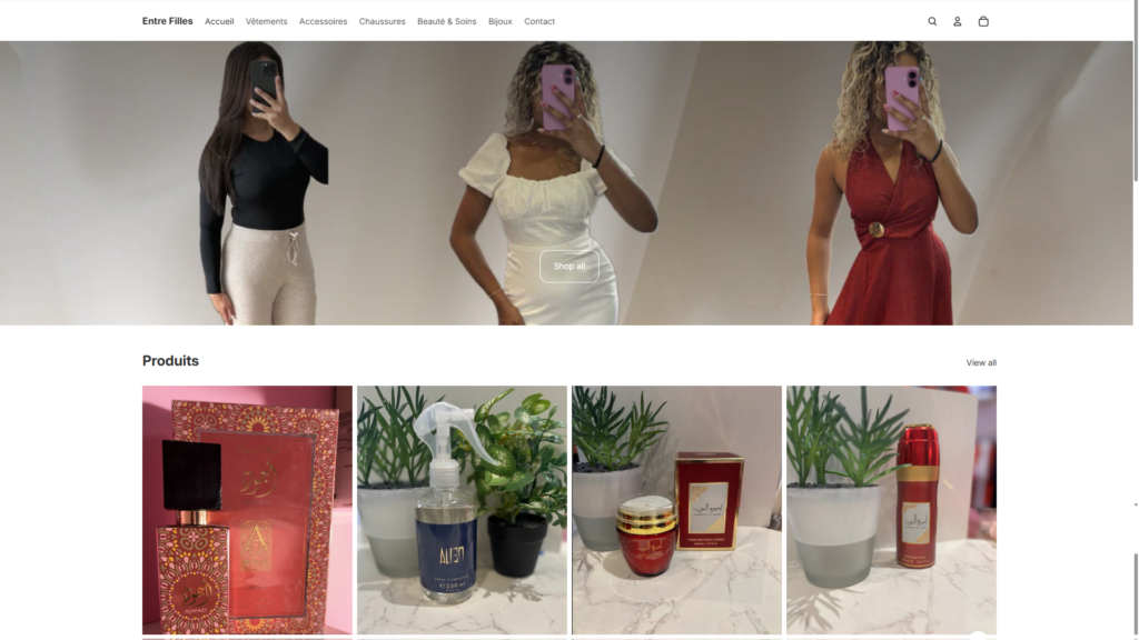 Pour Entre Filles, VVS Media a développé une boutique en ligne Shopify pensée pour simplifier la gestion des produits tout en offrant une expérience d’achat fluide et moderne. Le site présente l’ensemble du catalogue — vêtements, accessoires, beauté & soins, parfums — avec une mise en avant claire des collections et des produits phares.