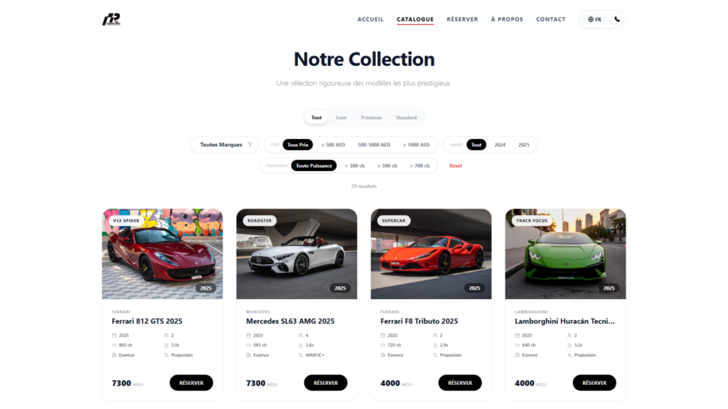 Le site intègre un catalogue entièrement dynamique, permettant aux utilisateurs de filtrer les véhicules par prix, puissance, catégorie ou année. Chaque fiche véhicule comprend photos HD, caractéristiques techniques et argumentaires commerciaux conçus pour faciliter la décision.